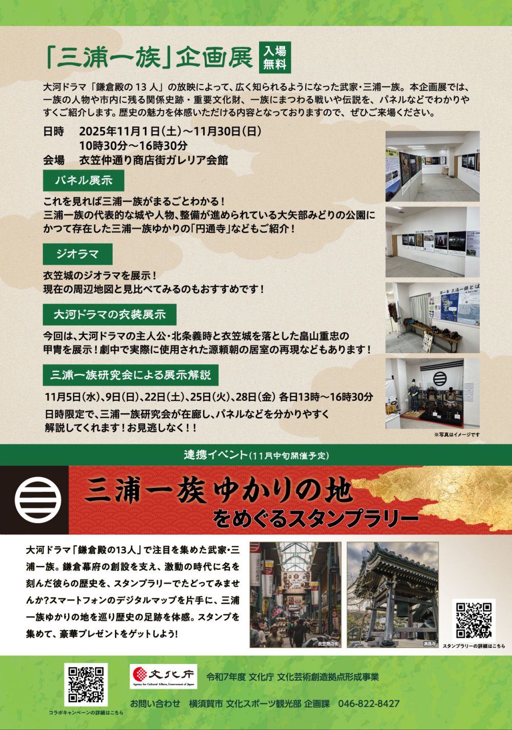 大河ドラマ「鎌倉殿の13人」の放映によって、広く知られるようになった武家・三浦一族。本企画展では、一族の人物や市内に残る関係史跡・重要文化財、一族にまつわる戦いや伝説を、パネルなどでわかりやすくご紹介します。 歴史の魅力を体感いただける内容となっておりますので、ぜひご来場ください。