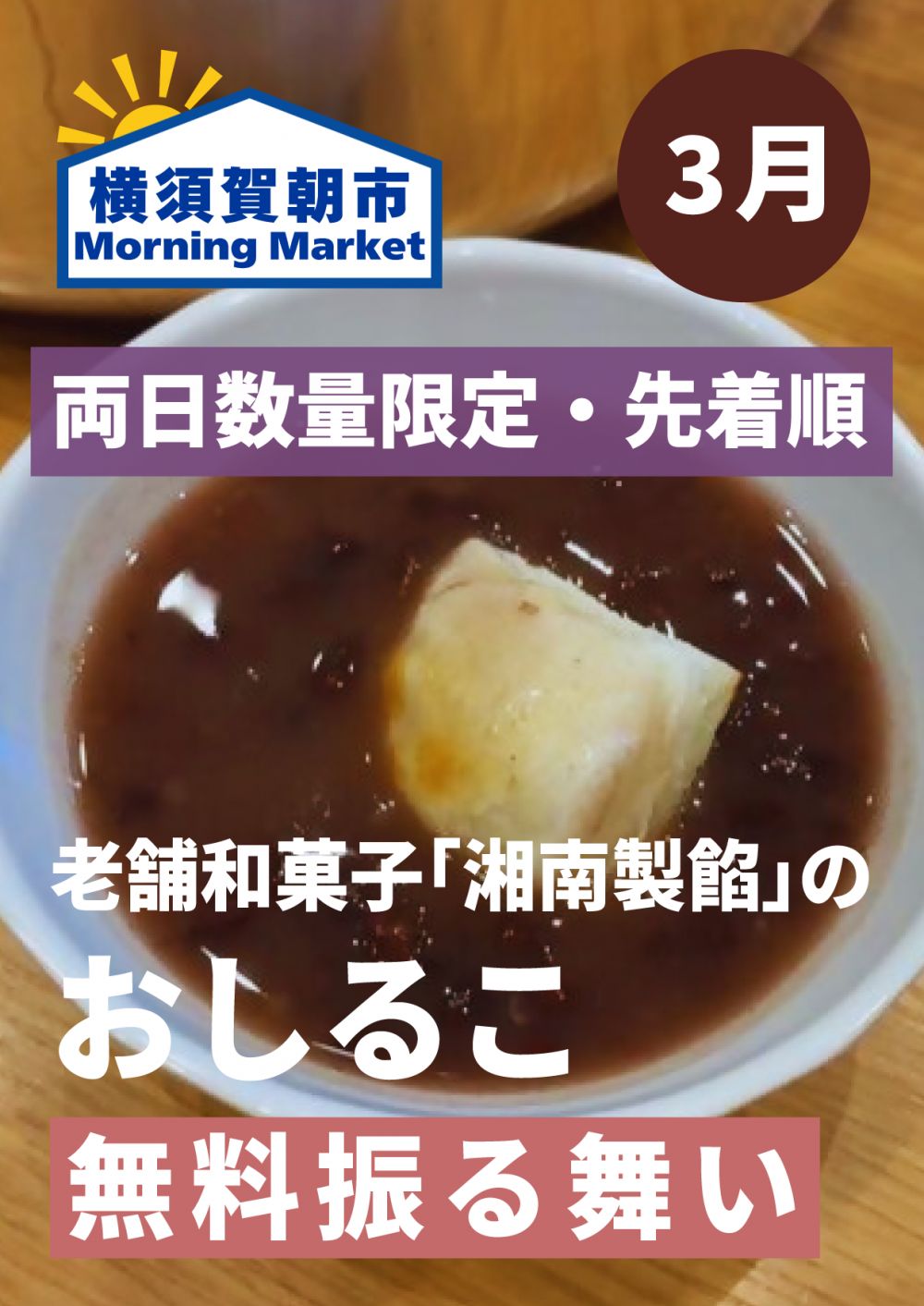 今月は老舗和菓子「湘南製餡」の「おしるこ」の無料振る舞いを実施!両日数量限定・先着順です。