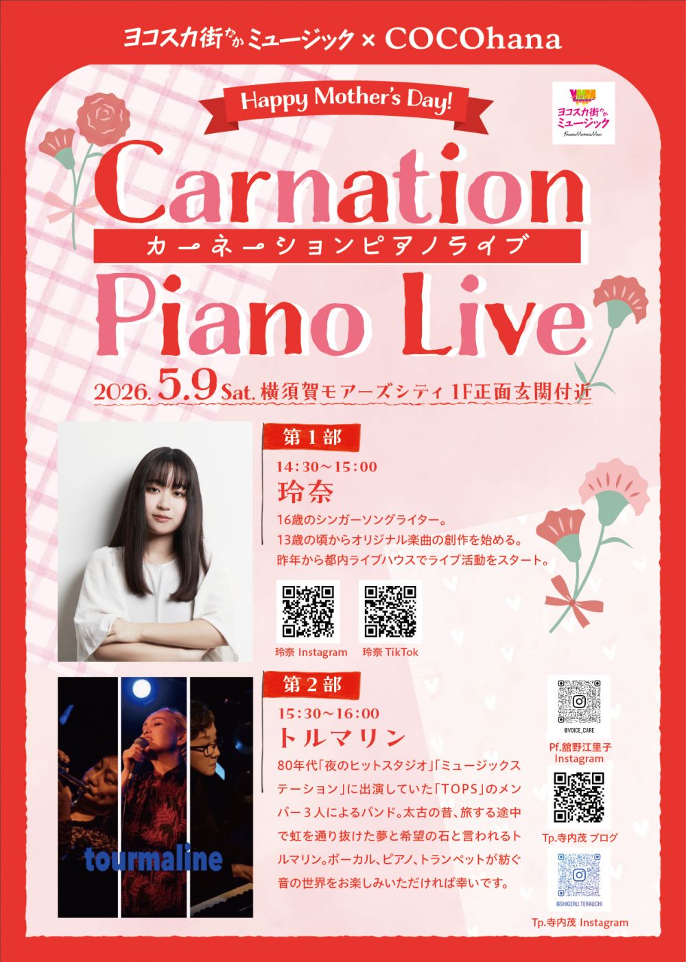 今回のヨコスカ街なかミュージックライブは、モアーズストリートのフラワーショップ COCOhana さんの協力をいただき、母の日イブのスペシャルライブを開催。 春らしい名曲の数々と母の日にちなんだオリジナル曲をお届けします。