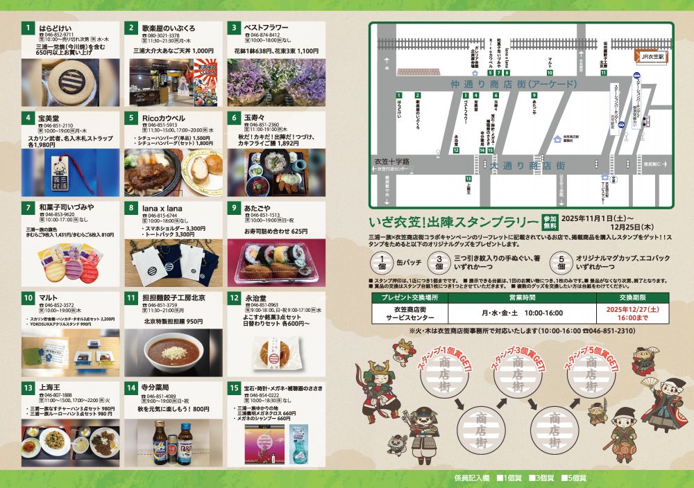 三浦一族×衣笠商店街コラボのキャンペーンのリーフレットに記載されているお店で、掲載商品を購入すると、スタンプをゲット!!スタンプをためると、オリジナルグッズをプレゼント!!